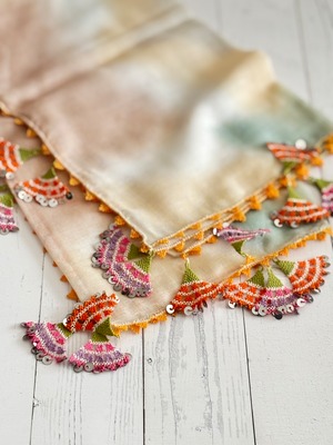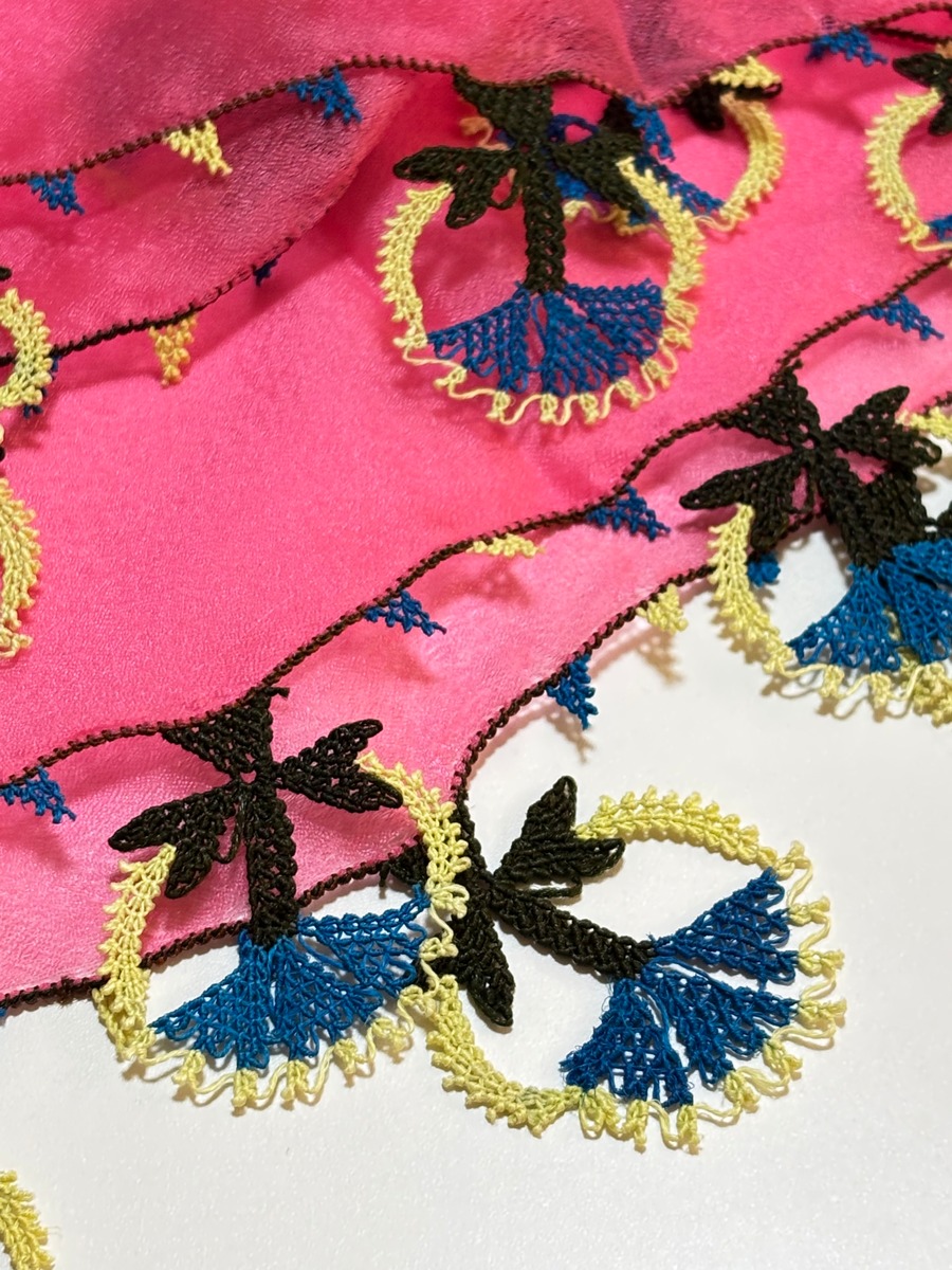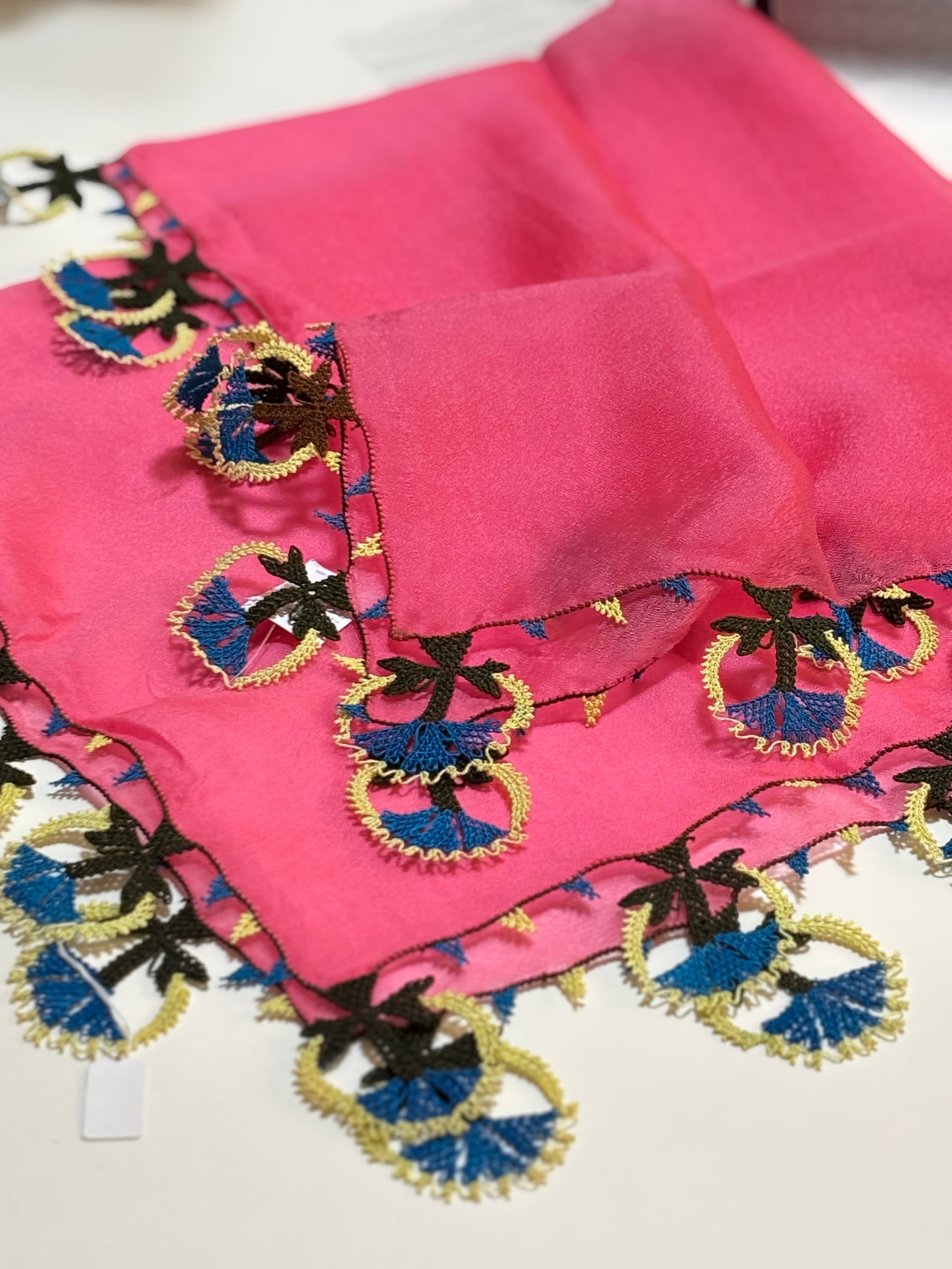 スカーフ生地はポリエステルのパッと明るい無地のピンクに、手染めのシルク糸で