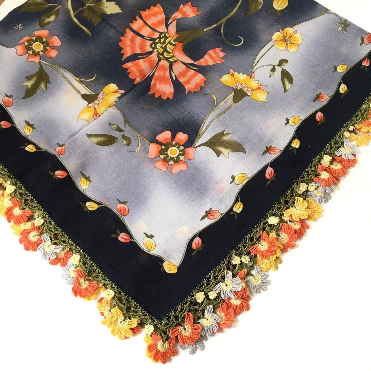 トゥーオヤの技法で作られた華やかで大きめなモチーフのオヤが特徴のスカーフになります。